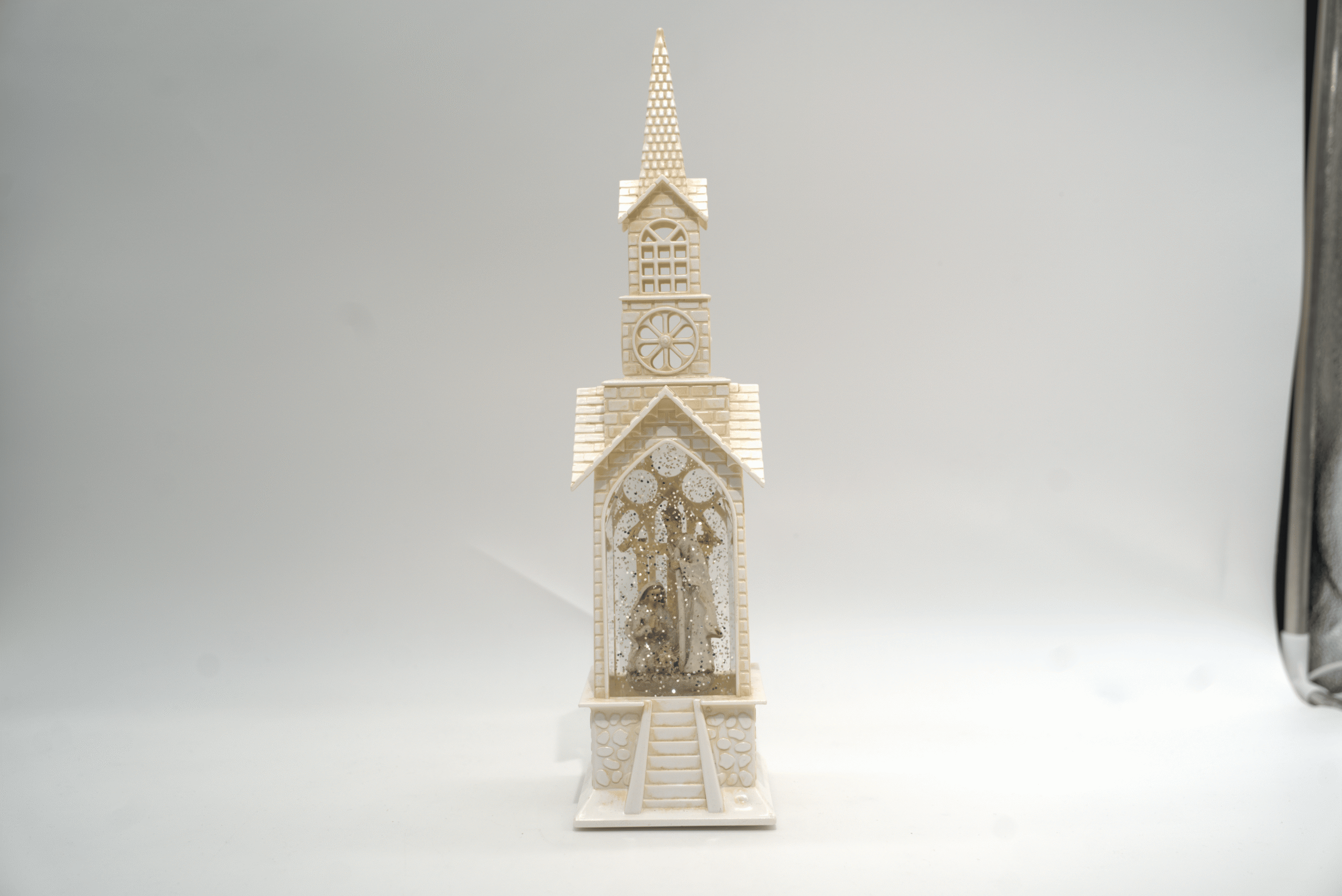 Bílý minimalistický kostelíček s betlémem přidá eleganci a klidný vizuální dojem do každého interiéru; decentní, ale velmi efektivní dekorace. Vyrobeno v Číně. 36cm x 9cm x 10cm