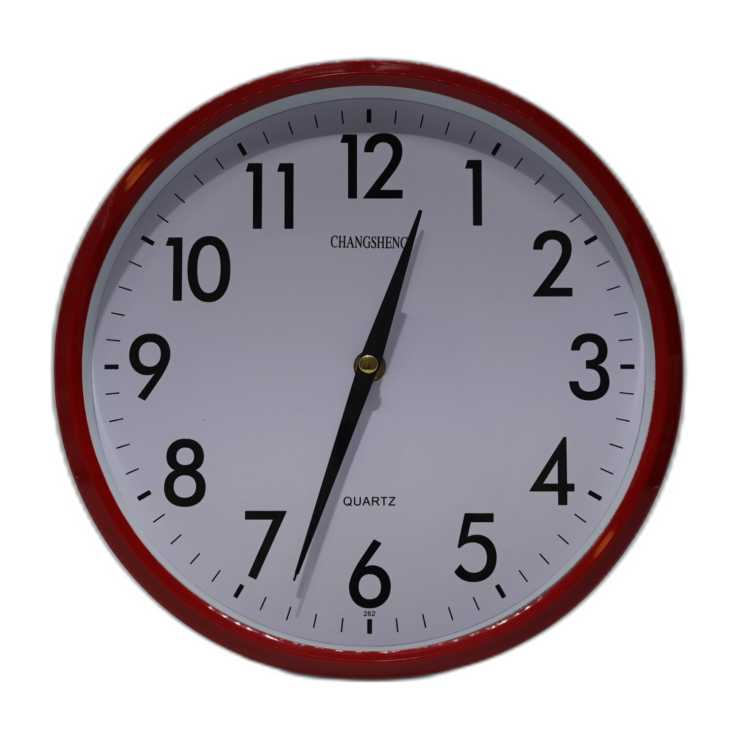 Hodiny s červeným rámem a přehledným ciferníkem, ideální pro domácnost i kancelářské prostory.