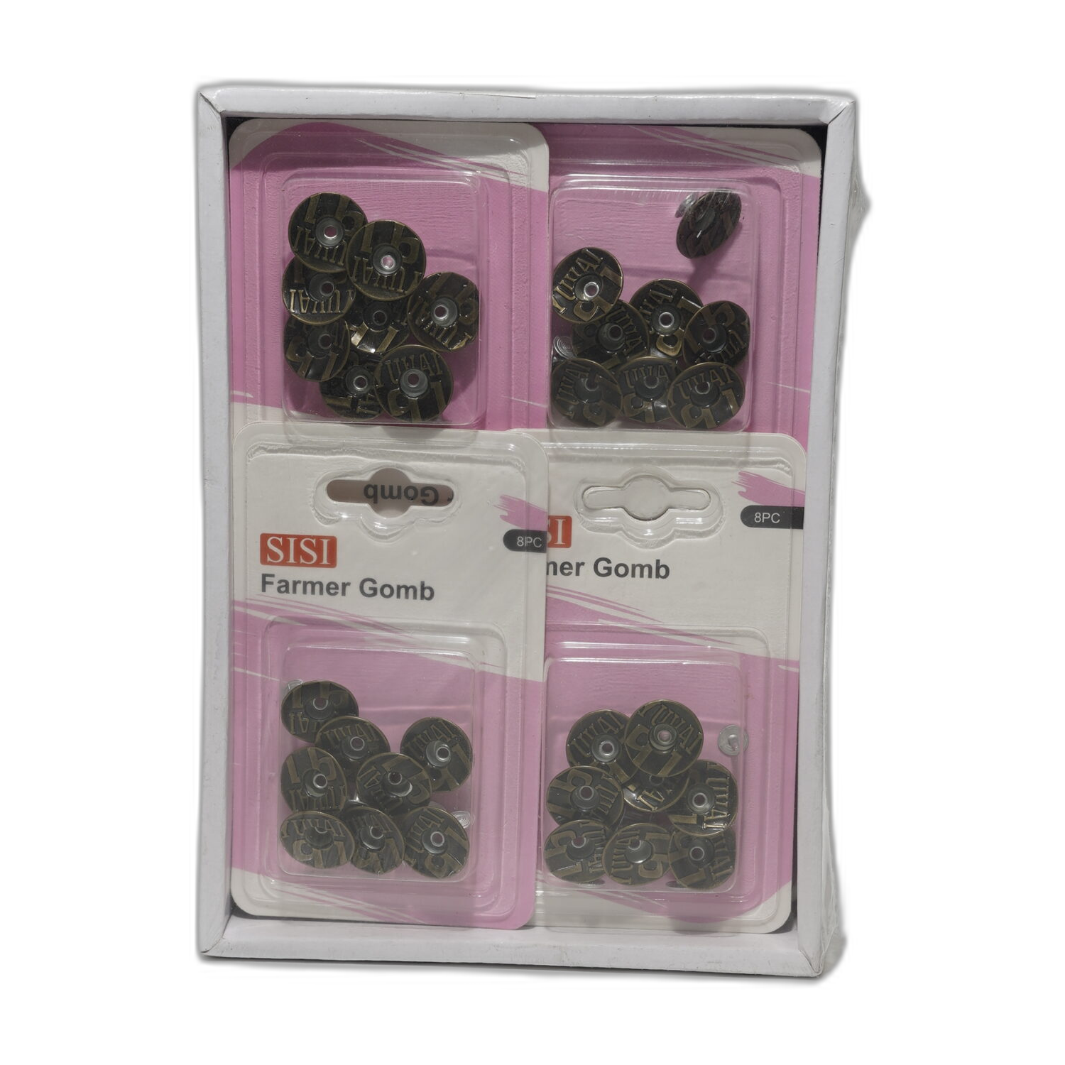 Praktická sada osmi riflových knoflíků, ideální pro opravy nebo výrobu riflového a pracovního oblečení.