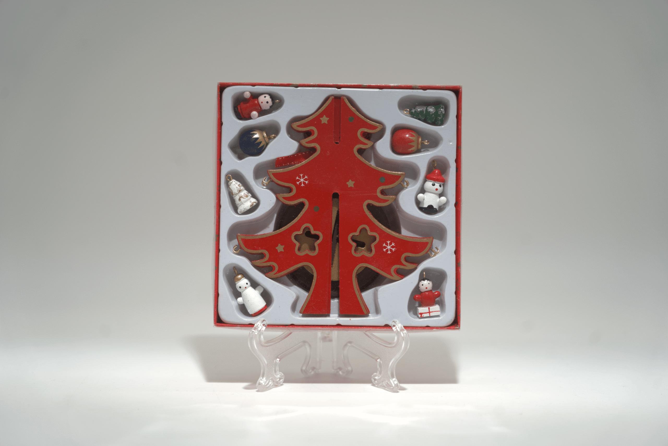 Skládací vánoční dřevěný stromeček s ornamenty