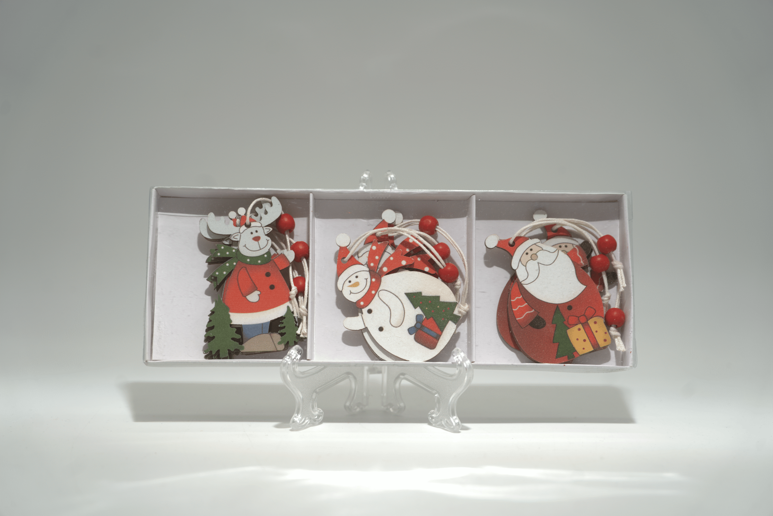 Varianta závěsné dekorace se sobem, sněhulákem a Santou.