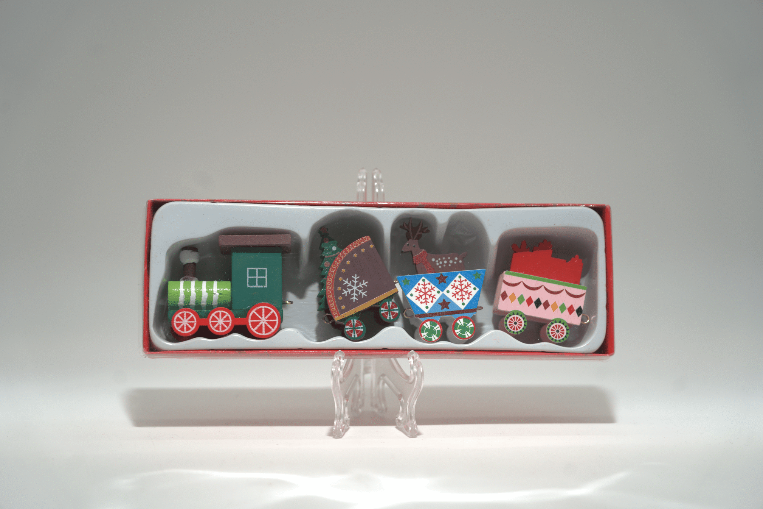 Závěsná dekorace vláčku se stromečkem pro sváteční atmosféru.