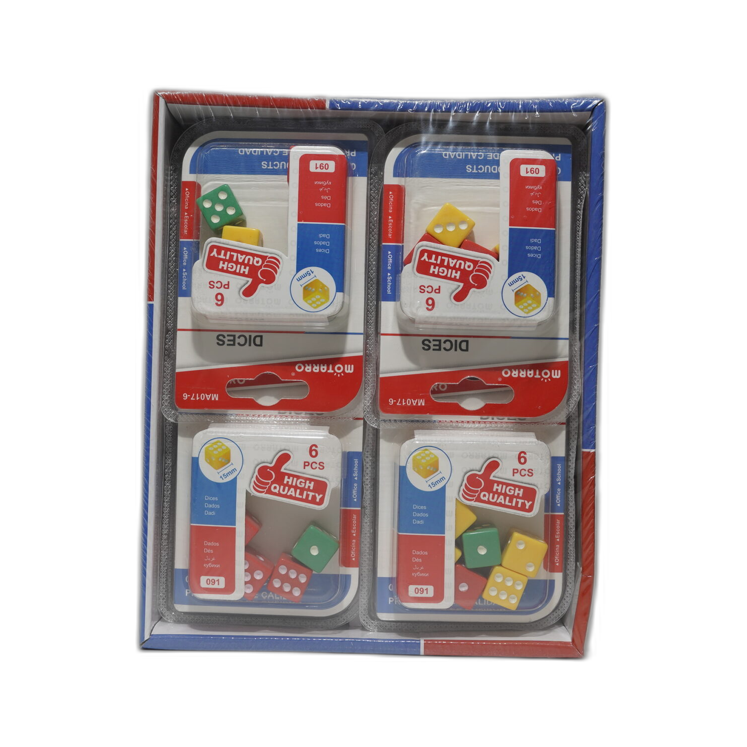 Barevné kostky v balení po 6 kusech, ideální pro stolní hry, výuku počítání nebo kreativní aktivity s dětmi.