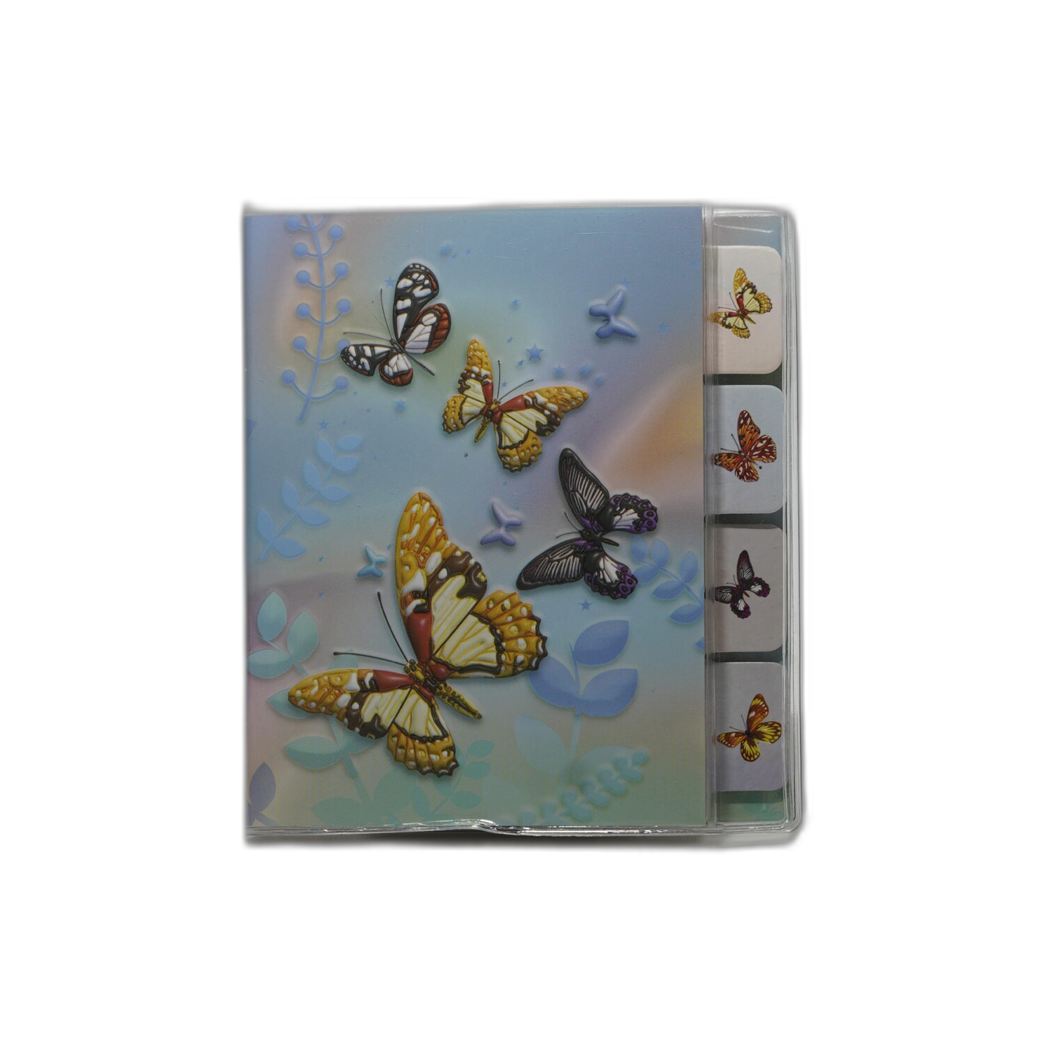 Modrý sešit s motýlky vhodný na poznámky, kresby a školní projekty.