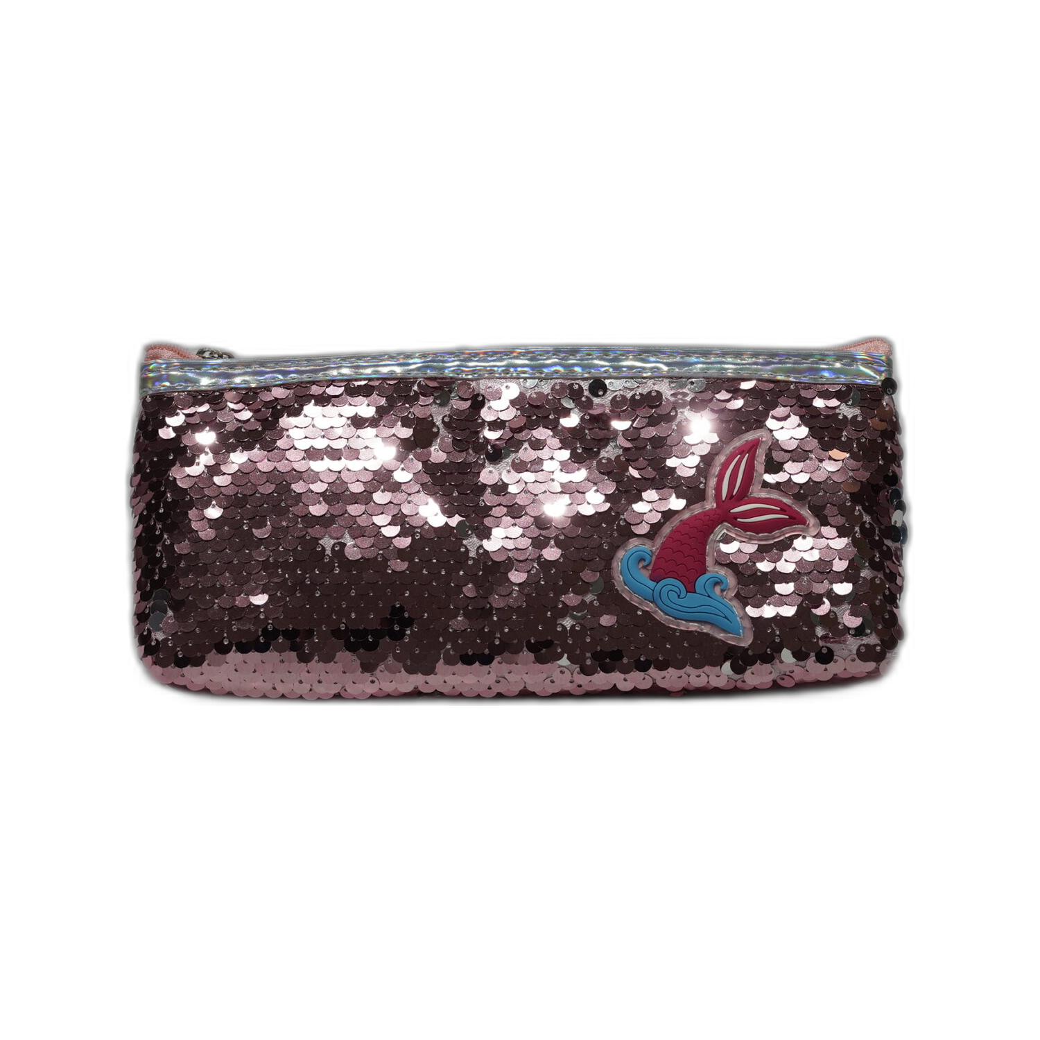 Růžový penál s šupinkami v moderním designu ideální na pastelky, tužky a drobnosti.