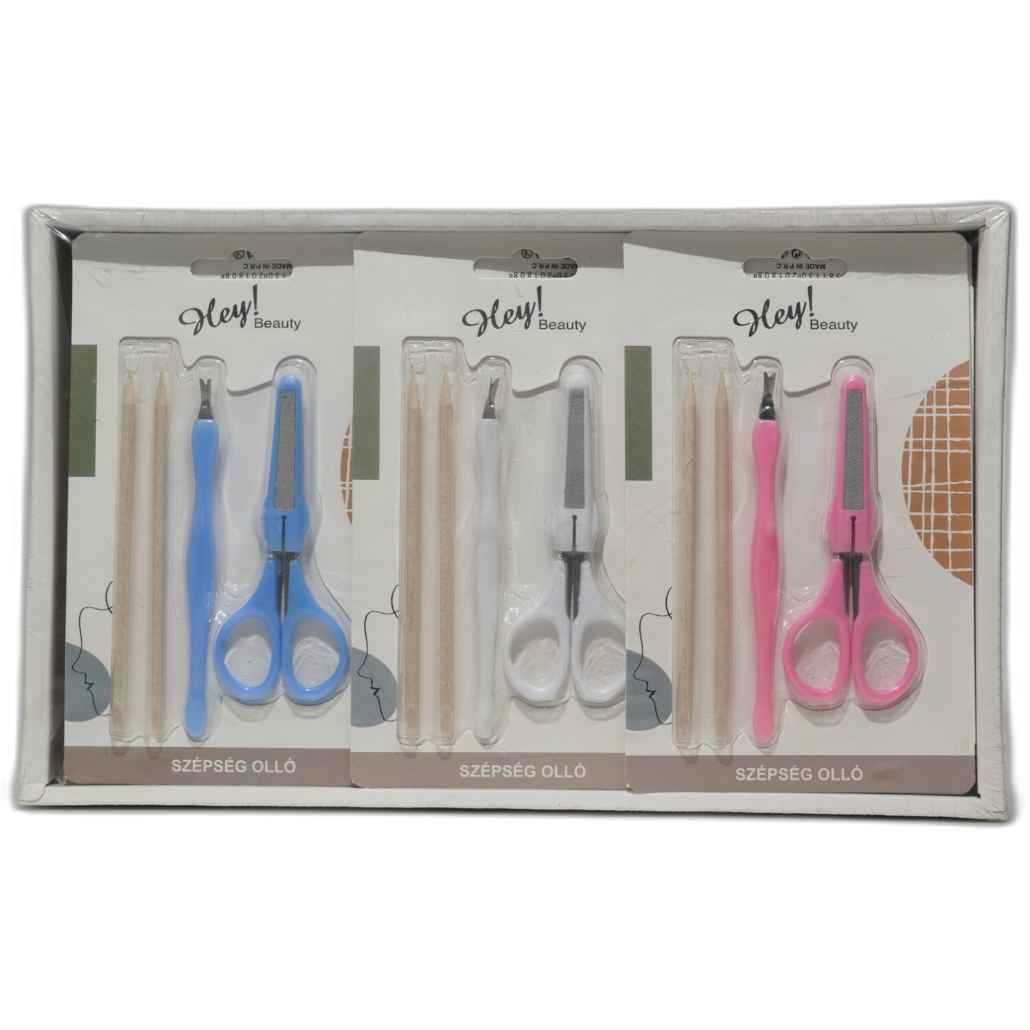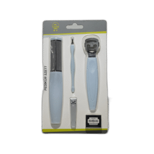 Kosmetický set na nehty v modré, bílé a růžové barvě, který obsahuje vše potřebné pro domácí manikúru.