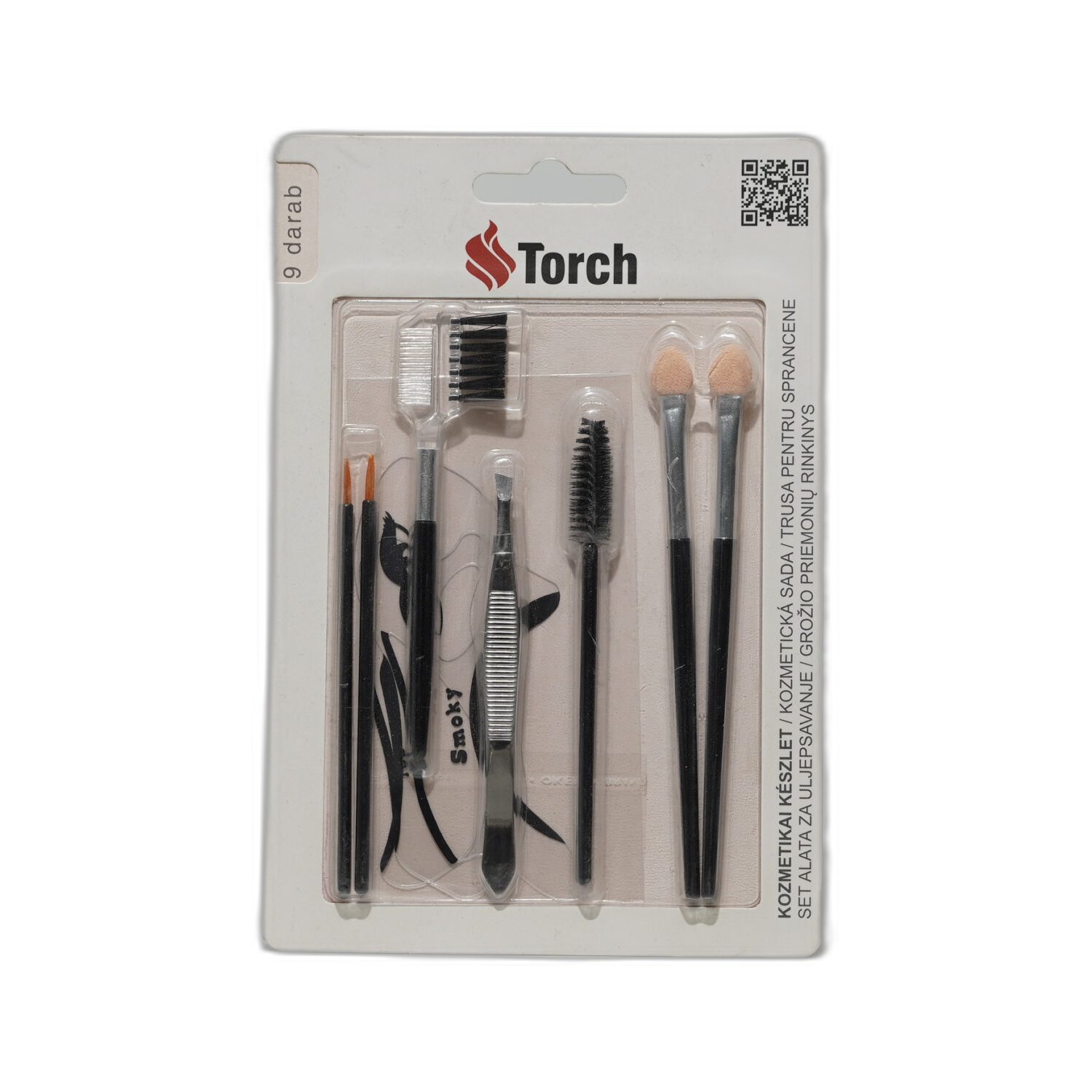 Kosmetická sada obsahující pinzetu a štětce, ideální pro úpravu obočí a precizní nanášení make-upu.