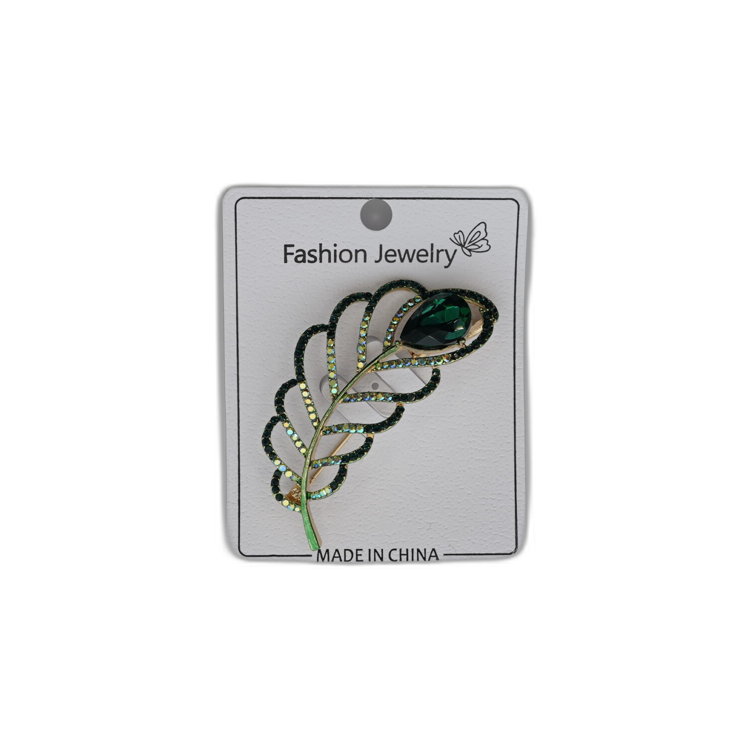 Brož se zeleným pírkem a kamínkem. Jemná kombinace přírody a třpytu pro výjimečný vzhled.