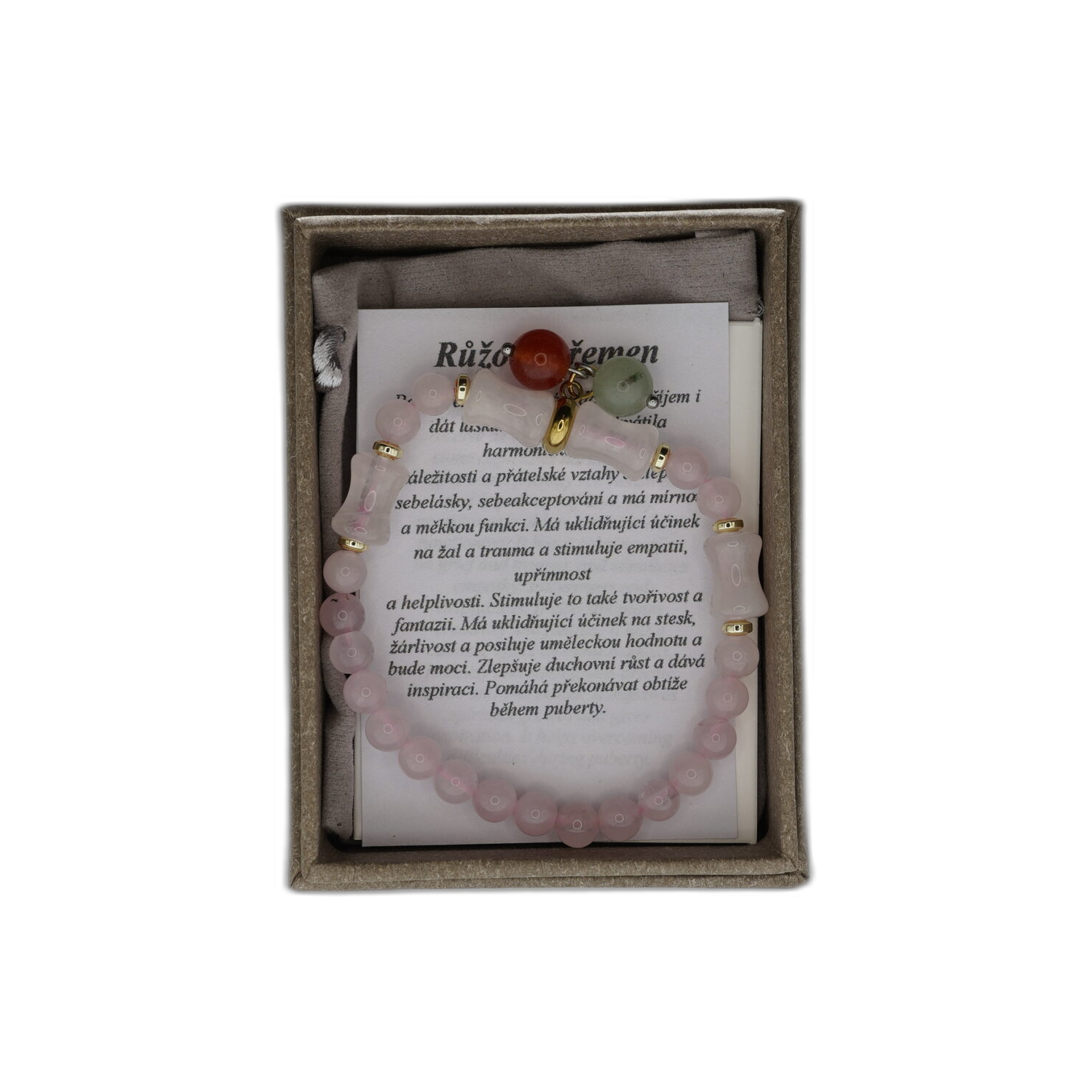Náramek z růženínu s pytlíčkem, který symbolizuje lásku a něhu. Skvělý dárek pro někoho, koho nosíte v srdci.