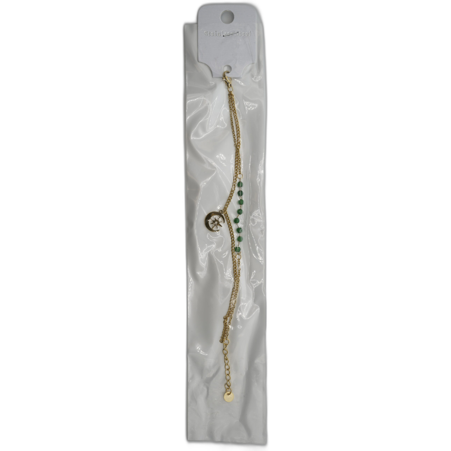 Zlatý náramek s půlměsícem a zelenými kamínky jako symbol naděje a ochrany. Elegantní doplněk pro speciální chvíle.