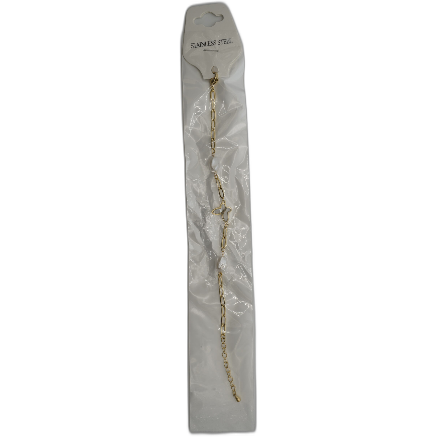 Zlatý náramek z nerezové oceli s motýlkem a perlami. Krásná kombinace jemnosti a elegance vhodná na každý den.