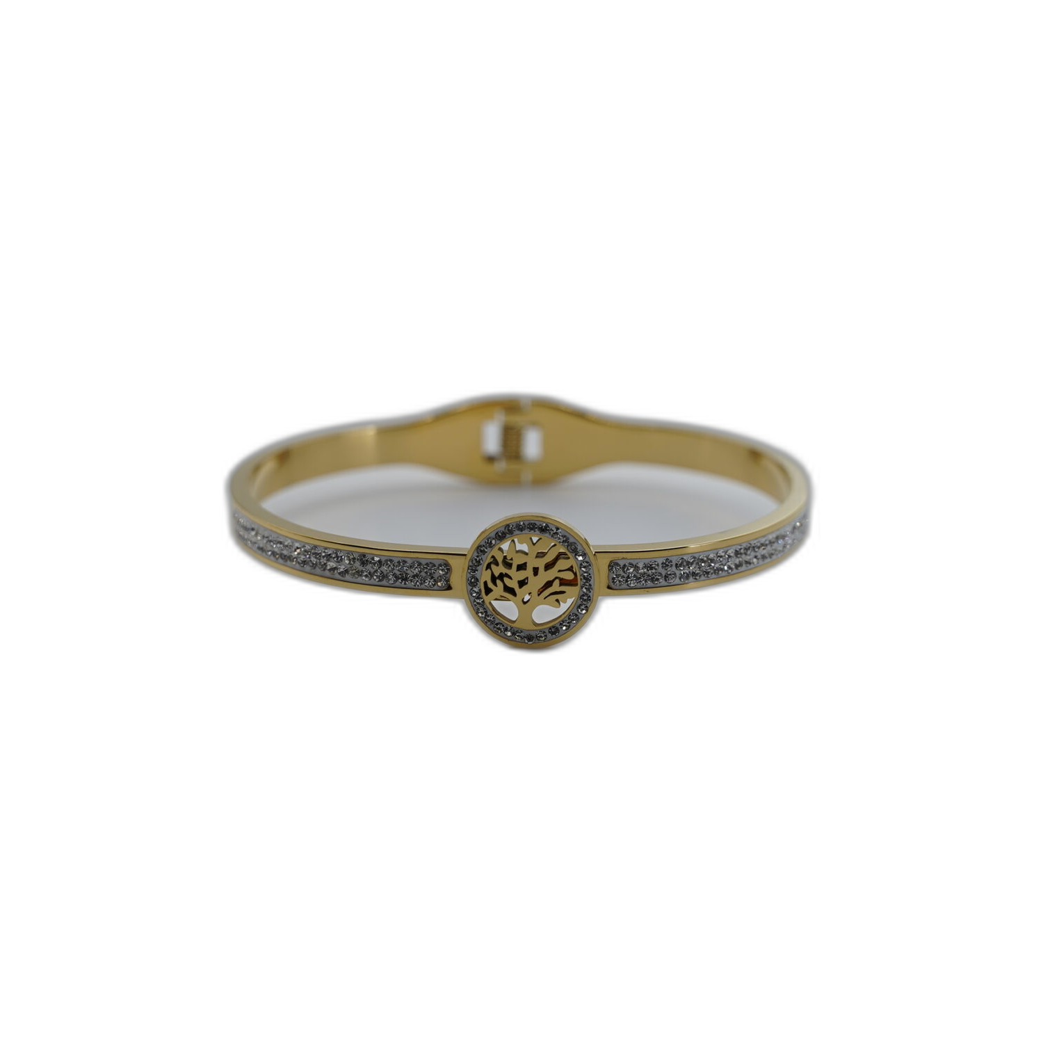 Zlatý náramek z nerezové oceli se stromečkem a kamínky. Krásný šperk symbolizující růst a spojení s přírodou v luxusním zlatém provedení.